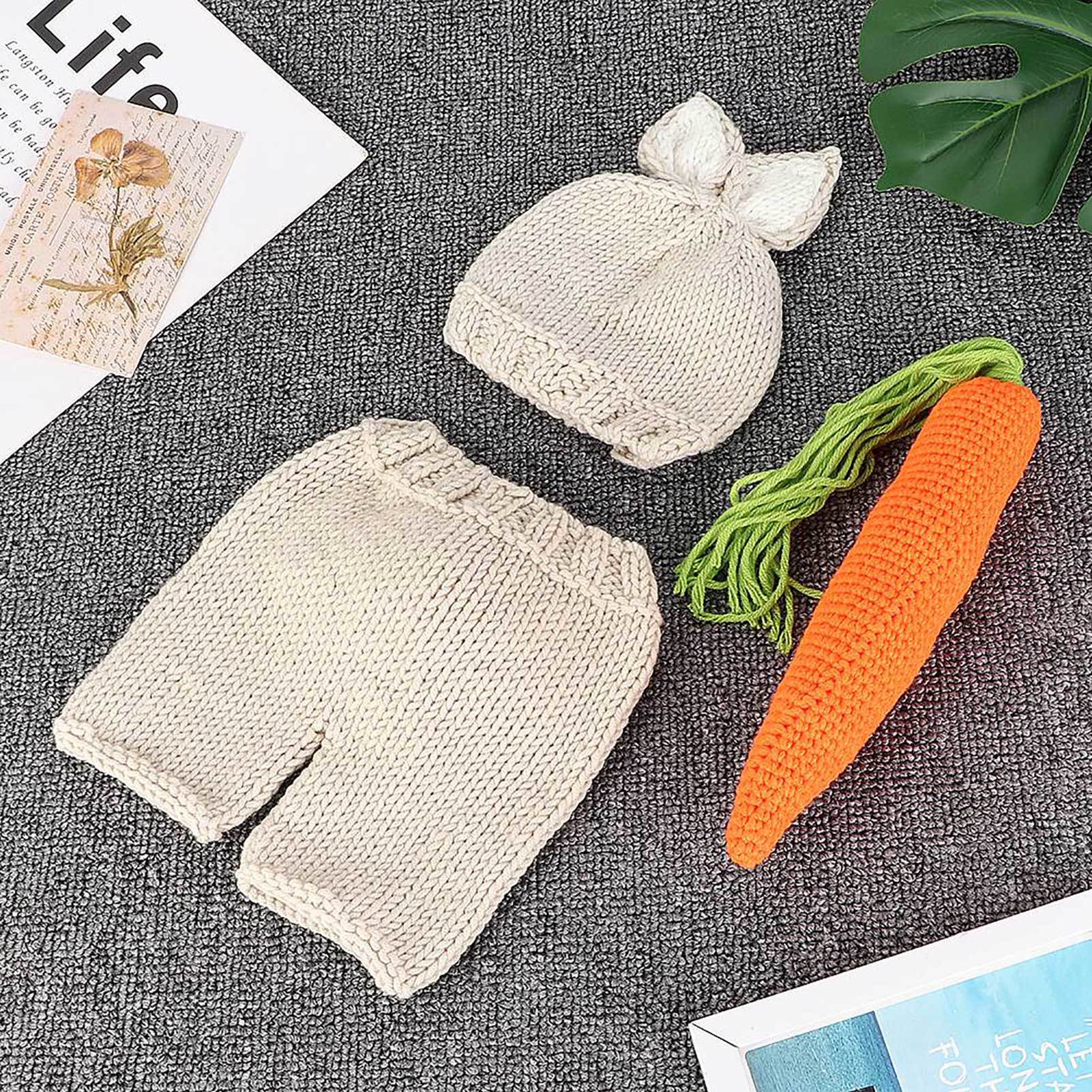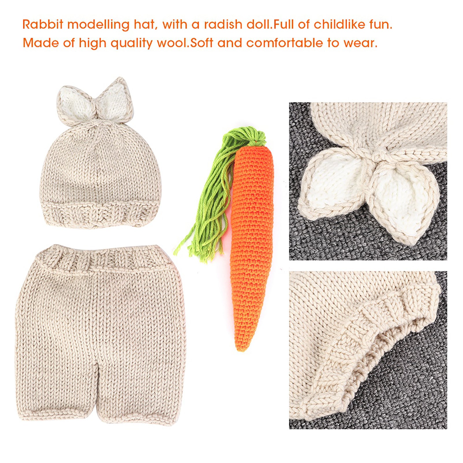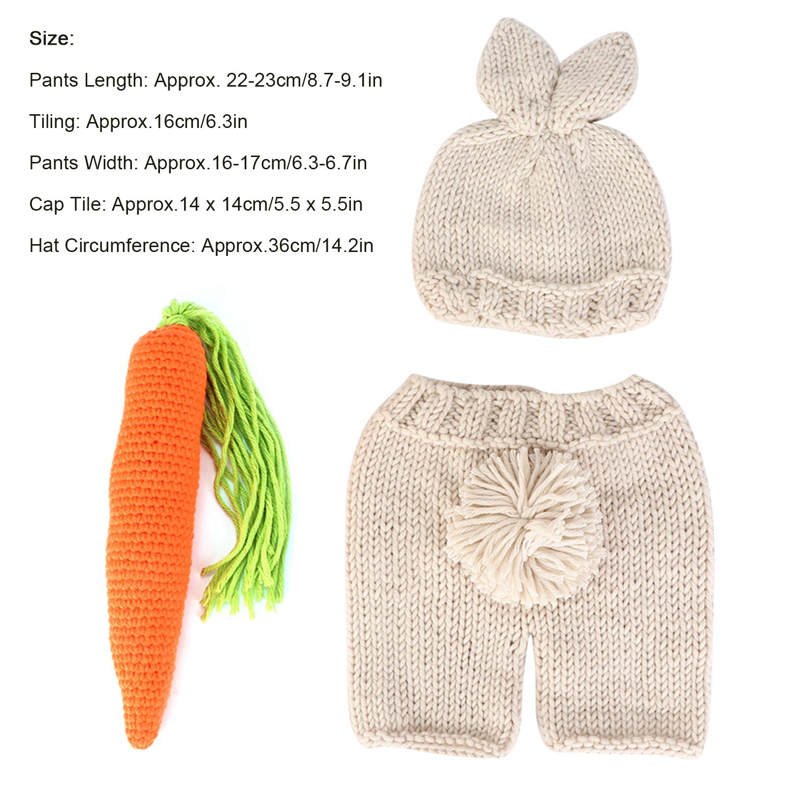 Features: Rabbit modelling hat, with a radish doll: Full of childlike fun. Perfect size: Suitable for newborn babies. Can be used for commemorative activities such as baby photography. Made of high quality wool: Soft and comfortable to wear. Fashionable design: Ideal for taking memorable photos of newborns. Specification: Material: wool Package size: approx. 26.5*24*1 cm / 10.4*9.4*0.4 inch Applicable age: 0-6 months baby Product Description: Ideal for taking memorable photos of newborns Size:Pants Length: Approx. 22-23cm/8.7-9.1inTiling: Approx.16cm/6.3inPants Width: Approx.16-17cm/6.3-6.7inCap Tile: Approx.14 x 14cm/5.5 x 5.5inHat Circumference: Approx.36cm/14.2in Package List: 1 * Hat 1 * Pants 1 * Doll
